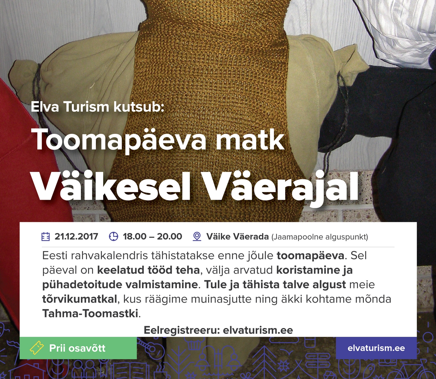 pööripäeva ning sel aastal ka talve algusega. Koguneme kell 18:00 Väikese Väeraja alguspunkti (Elva jaamahoone poolses otsas). Seejärel suundume tõrvikutega rajale, kus heidame pilgu Eesti folkloorimaailma, kui oleme jõudnud oma matkaga Elva paisjärve äärde, soendame end lõkkepaistel, kostitame sooja ja magusaga