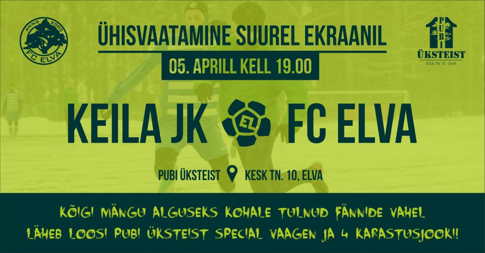 1. Tule täna õhtul Elvasse Pubisse Üksteist vaatama otseülekannet Esiliiga mängust Keila JK vs FC Elva. Kohtumine algab kell 19:00 kanaliks internetileht www.soccernet.ee