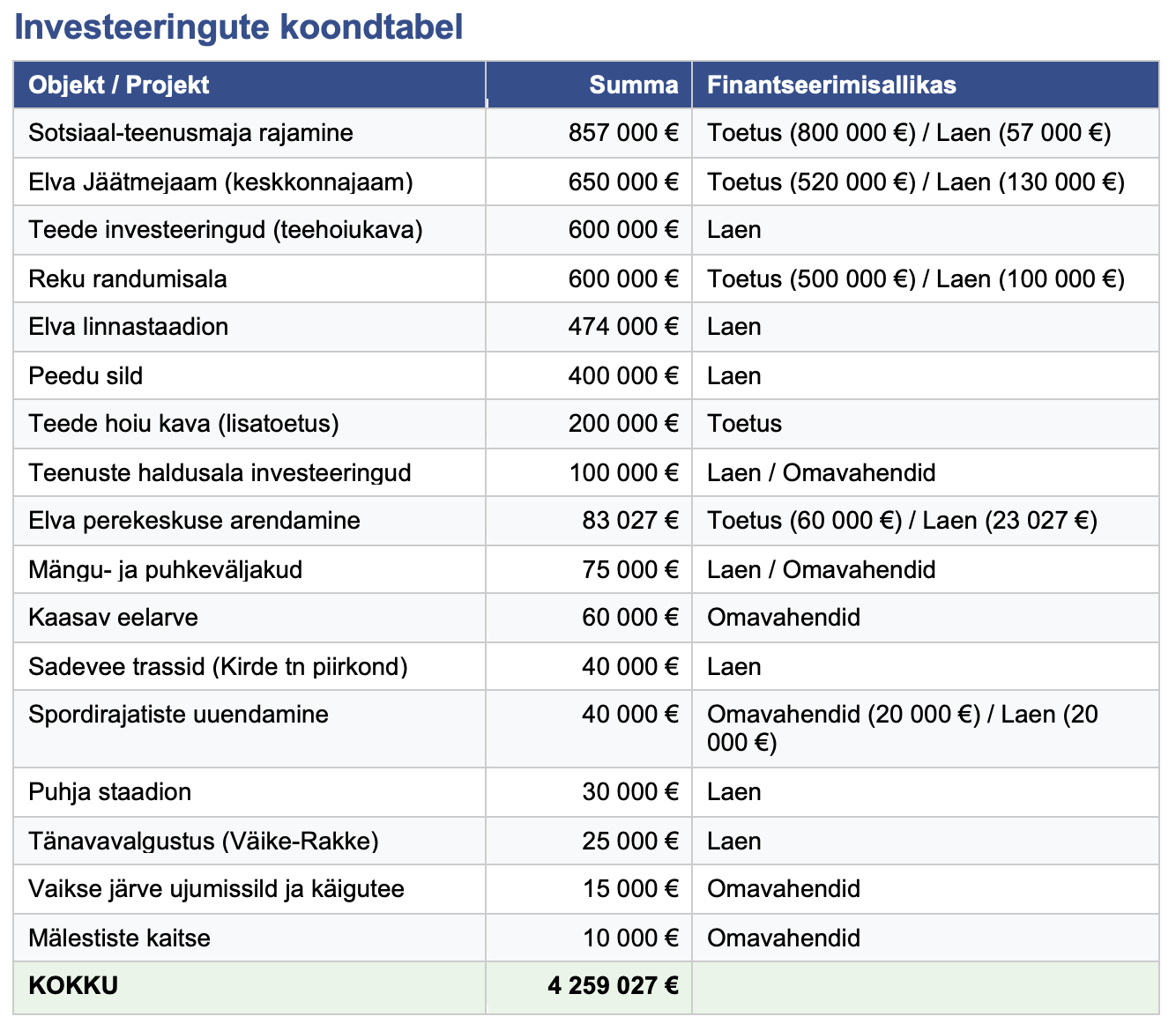 Vallavalitsus on 2026. aasta eelarvesse kavandanud investeeringuid kogumahus 4 259 027 €. Investeeringud hõlmavad nii sotsiaalvaldkonna arendamist, taristu parandamist kui ka vaba aja veetmise võimaluste laiendamist.