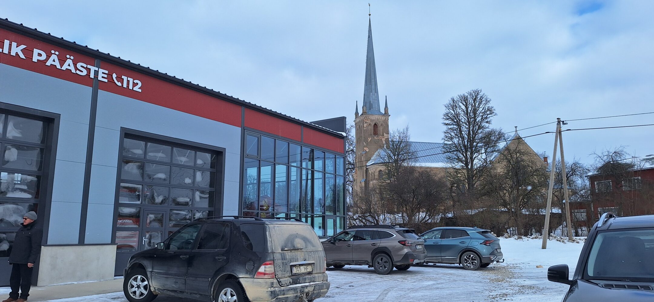 Rõngu Vabatahtlik Päästeselts, taamal Rõngu kirik, mis samuti valla eelarvest rahalise toetuse sai (16.02.2026), päästehoone esine plats saab sellel aastal raudbetoonkatte, mis kannatab ka raskete päästemasinate liikumist, foto: Elva Elu