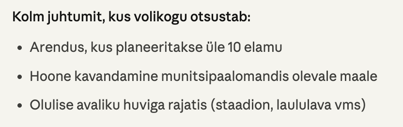 Volikogule läheb otsustada detailplaneeringu menetlus kolmel juhul: kui arenduspiirkonnas soovitakse püstitada üle kümne elamu, kui hoone kavandatakse munitsipaalomandis olevale maale, või kui tegemist on olulise avaliku huviga rajatisega – näiteks staadioni, laululava või muu suure ühiskondliku mõjuga ehitisega. Vallavalitsuse hinnangul mõjutab muudatus keskmiselt 1-2 suuremat planeeringut aastas, mille nii algatamine kui kehtestamine on volikogu hääletada.